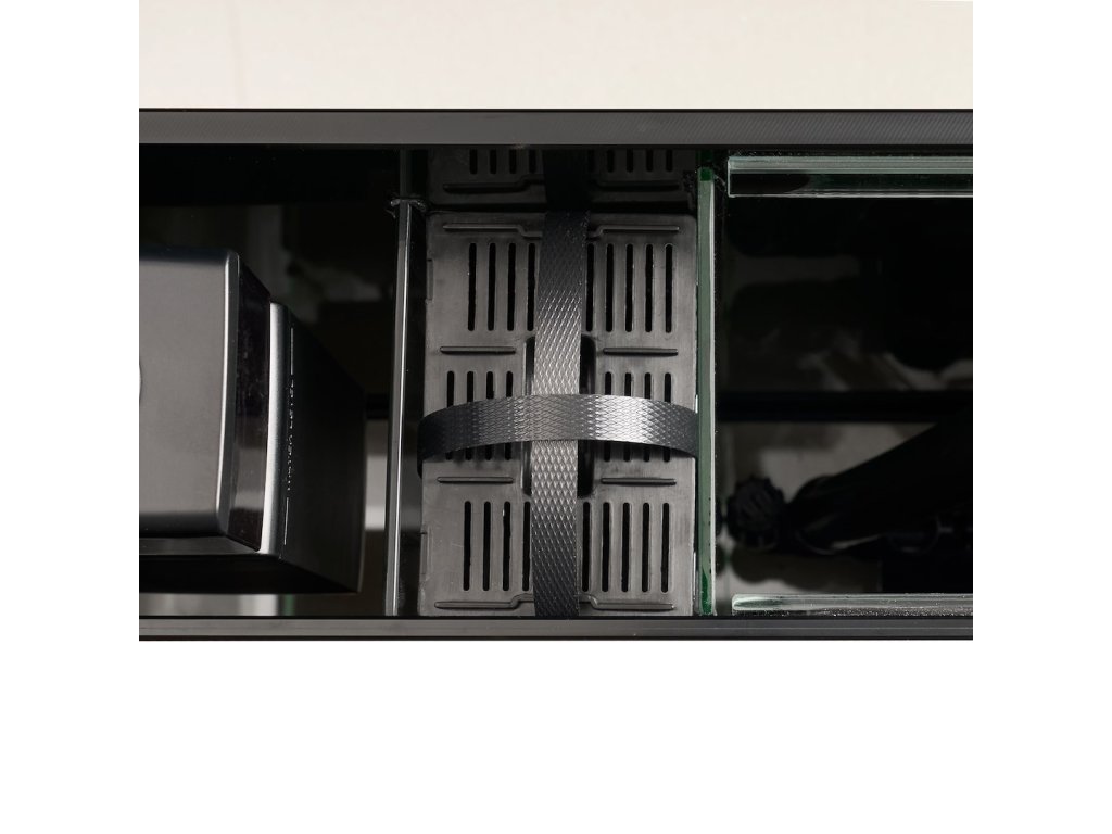 Skříňka Glossy Marine má ideální rozměry pro akvárium (60x58,5 cm) a výšku 87 cm, což umožňuje pohodlnou údržbu a správné vystavení nádrže. Je vyrobena z lesklých MDF desek potažených akrylem a má jedny dveře v jedné rovině s předním sklem akvária, což zajišťuje harmonický a elegantní vzhled. Nastavitelné nožičky umožňují přesné vyrovnání a vnitřek skříňky poskytuje prostor pro příslušenství a technické vybavení. Kvalitní černá povrchová úprava podtrhuje moderní design a činí ze soupravy ústřední dekorativní prvek místnosti.