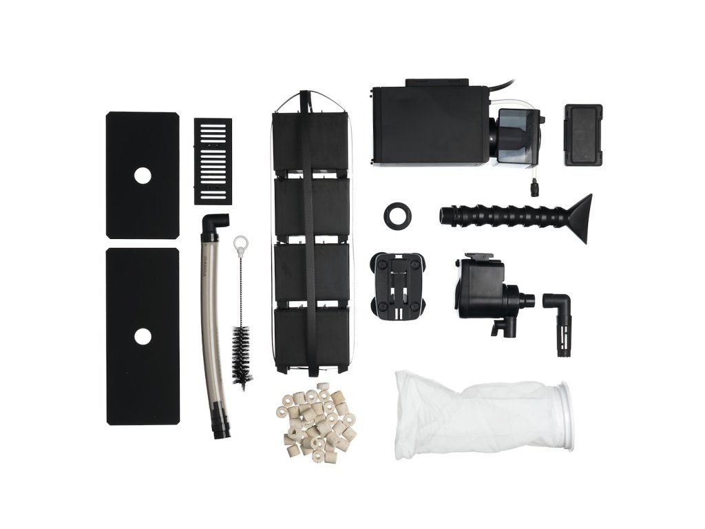 - Provedení: otevřená nádrž o rozměrech 60x58x50 cm s objemem cca 170 l, zadní filtrační panel s 5 komorami, odpěňovač bílkovin
