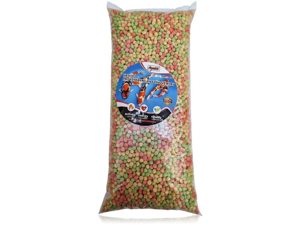 Doplňkové krmivo pro venkovní a bazénové ryby ve formě kuliček.