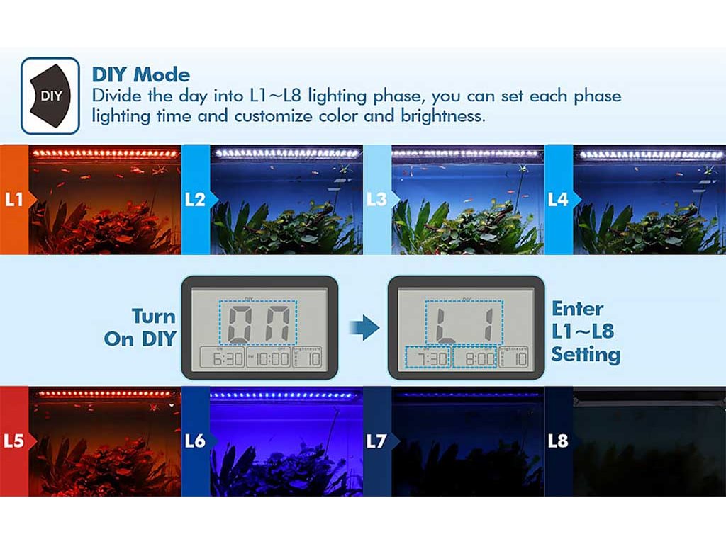 - DIY režim: Upravte až 8 fází osvětlení během dne, s možností přizpůsobení barev, jasu a času pro každou fázi. Tento režim poskytuje plnou kontrolu nad světelnými podmínkami pro specifické potřeby vašich rostlin.