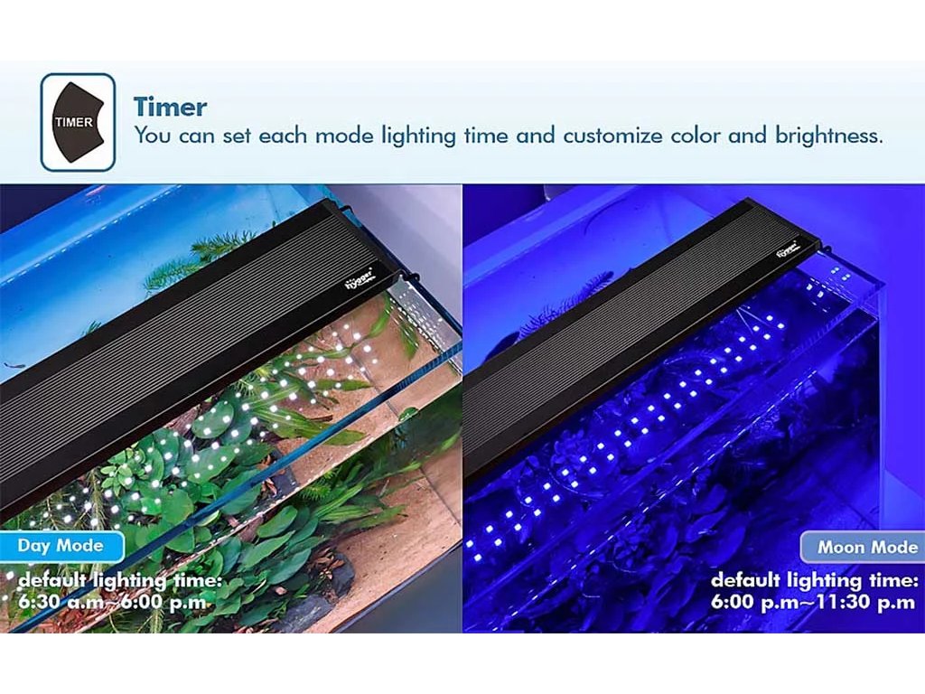 Díky přiloženému dálkovému ovládání můžete snadno změnit nastavení světla na vzdálenost až 10 metrů. Upravte spektrum barev, jas a časování osvětlení, přičemž vše se přehledně zobrazuje na integrovaném LCD displeji. Tento uživatelsky přívětivý systém zajišťuje přesné ovládání, umožňující vytvoření ideálního prostředí pro vaše rostliny i ryby.