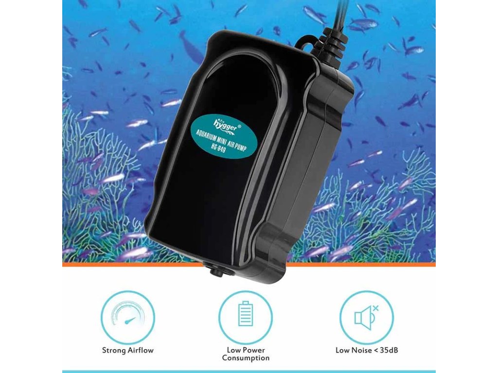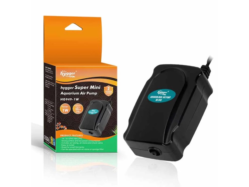 - Hygger HG-949 je mini vzduchovací set vhodný pro akvária o objemu od 20 do 80 litrů. - Díky nízké spotřebě pouze 1 W a průtoku až 190 l/h je ideální pro vzduchovací kameny, dekorace a malé biofiltry.
