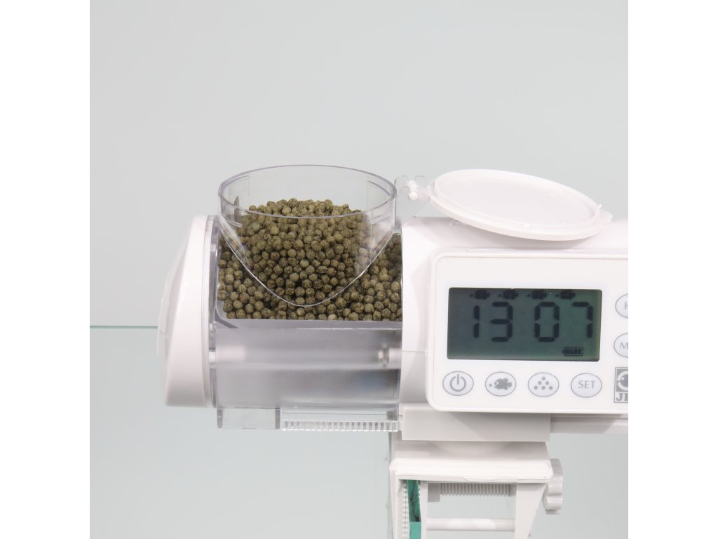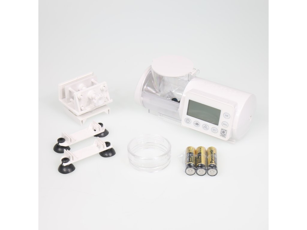 Praktické automatické zakrmovací zařízení: Automatické zakrmování akvarijních ryb – pro jakékoli granule do 3 mm. Balení obsahuje: Zakrmovací automat pro akvarijní ryby s upevněním a bateriemi 3x 1,5 V AA.