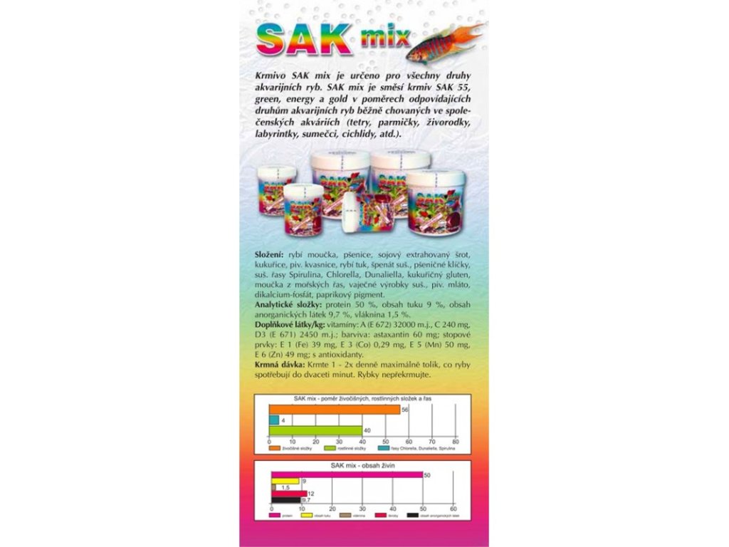 Kompletní plnohodnotné extrudované krmivo pro všechny druhy akvarijních ryb. Jedná se o směs krmiv SAK 55, green, energy a gold v poměrech odpovídajících druhům akvarijních ryb běžně chovaných ve společenských akváriích (tetry, parmičky, živorodky, sumečci, cichlidy, čichavci…). Vyvážený poměr mezi jednotlivými druhy krmiva SAK, vysoký obsah vitamínů a minerálních látek umožňuje spolehlivé pokrytí všech potravních nároků a zajišťuje plné vybarvení a zdravý vývoj ryb. Krmivo je vysoce stravitelné, měkké, zvolna klesá ke dnu, nekalí vodu a nerozpadá se.