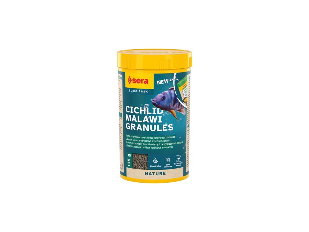 (sera Granugreen Nature 250 ml). Základní krmivo pro malé až střední východoafrické cichlidy z jezer Malawi a Tanganika.