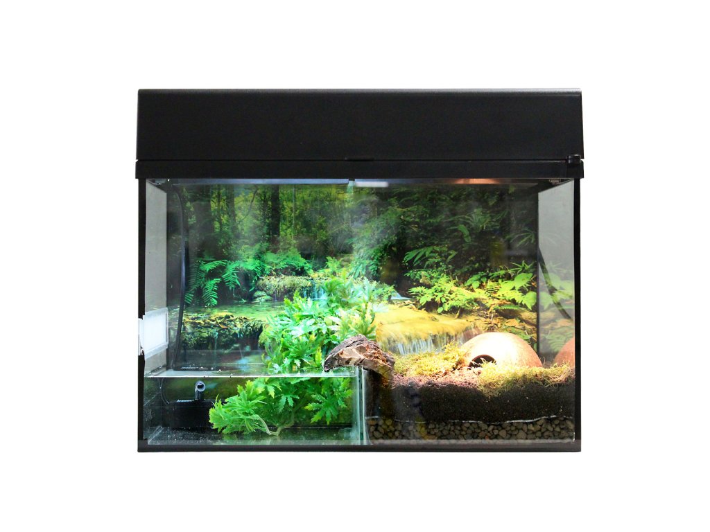 - sklenené terárium s praktickým plastovým krytom (so skrytými technickými prvkami)