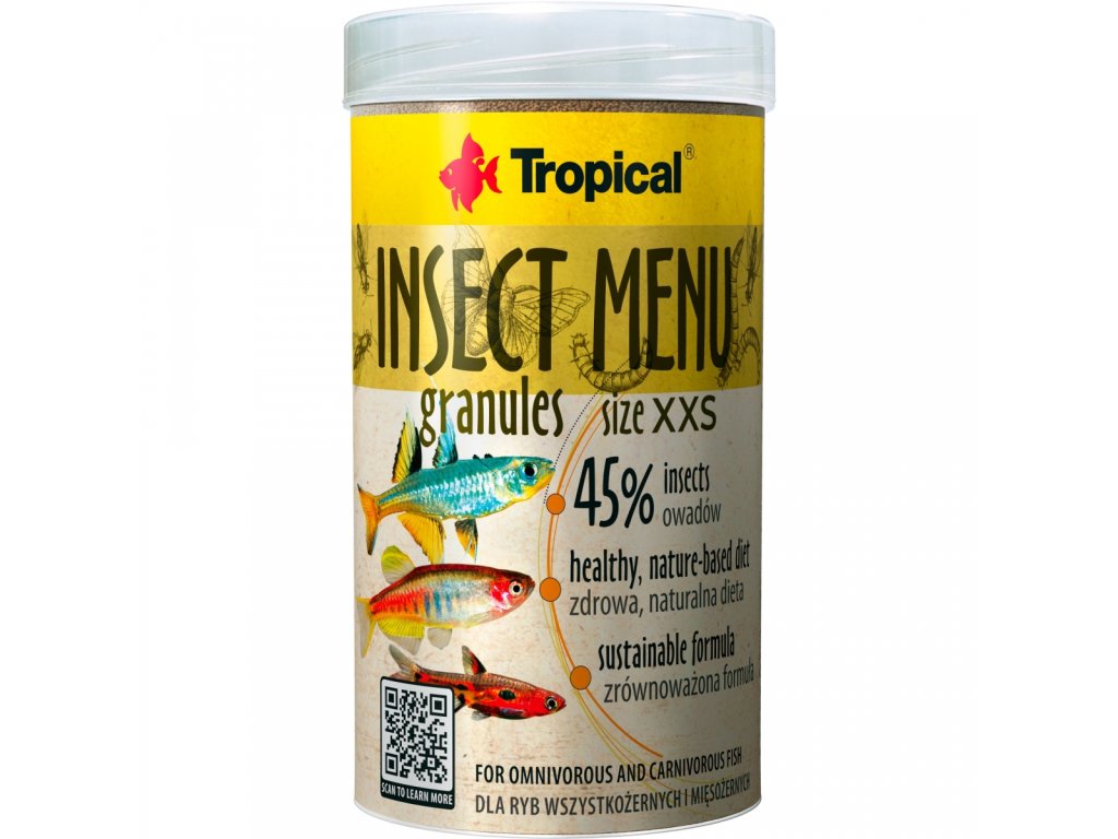 Krmivo zlepšující barvu ve formě velmi drobných potápějících se granulí pro všežravé a masožravé akvarijní ryby, na bázi 3 hmyzu: hermetie (15%), bource morušového (15%) a moučného červa (15%), se vzorcem Color Booster společnosti Tropical.